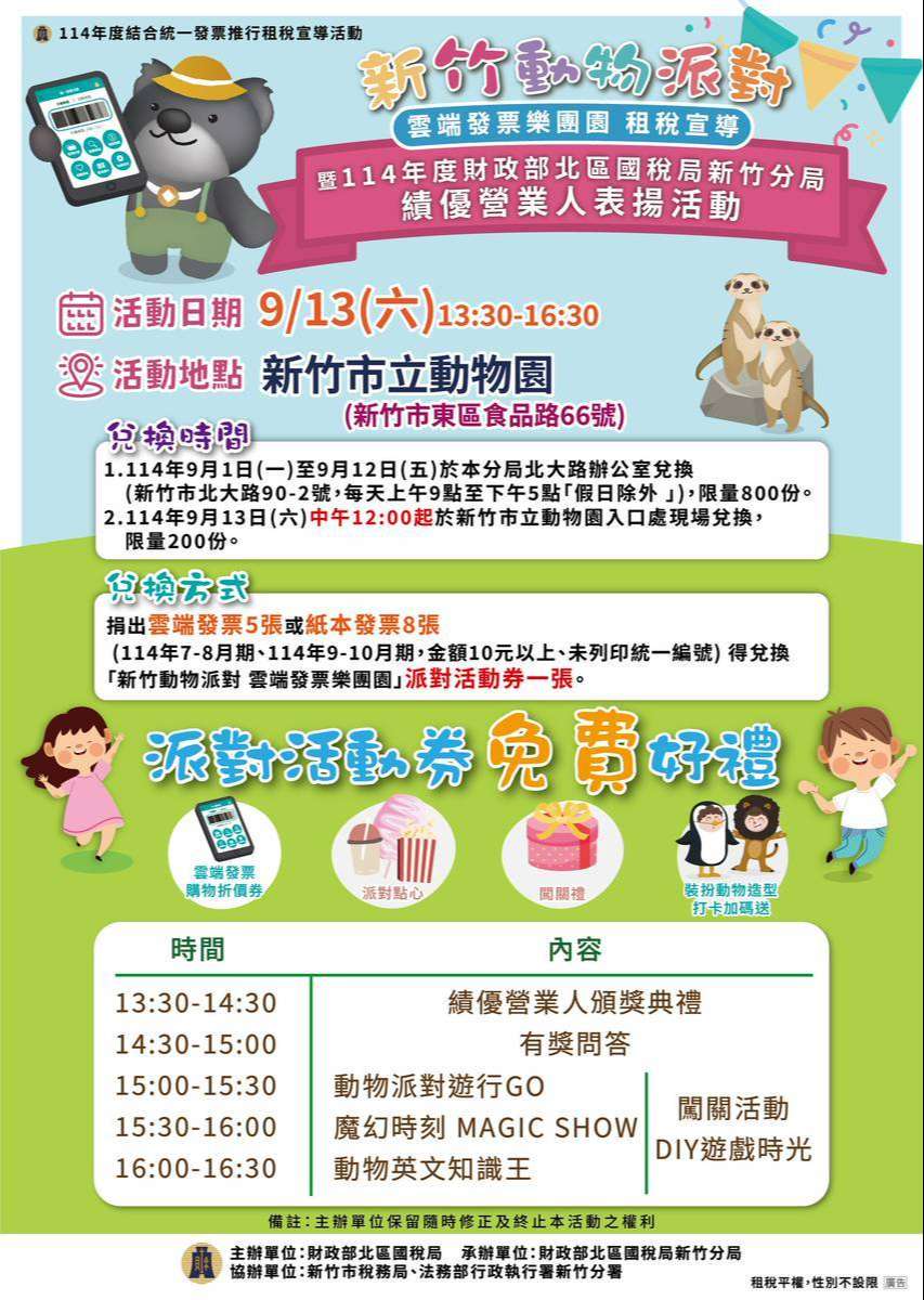檢送本分局114年9月13日舉辦「新竹動物派對 雲端發票樂團園」租稅宣導暨114年度新竹分局績優營業人表揚活動宣導海報乙紙(或電子檔),懇請貴校(貴里)張貼海報於網頁首頁或公佈欄。請參閱附件。