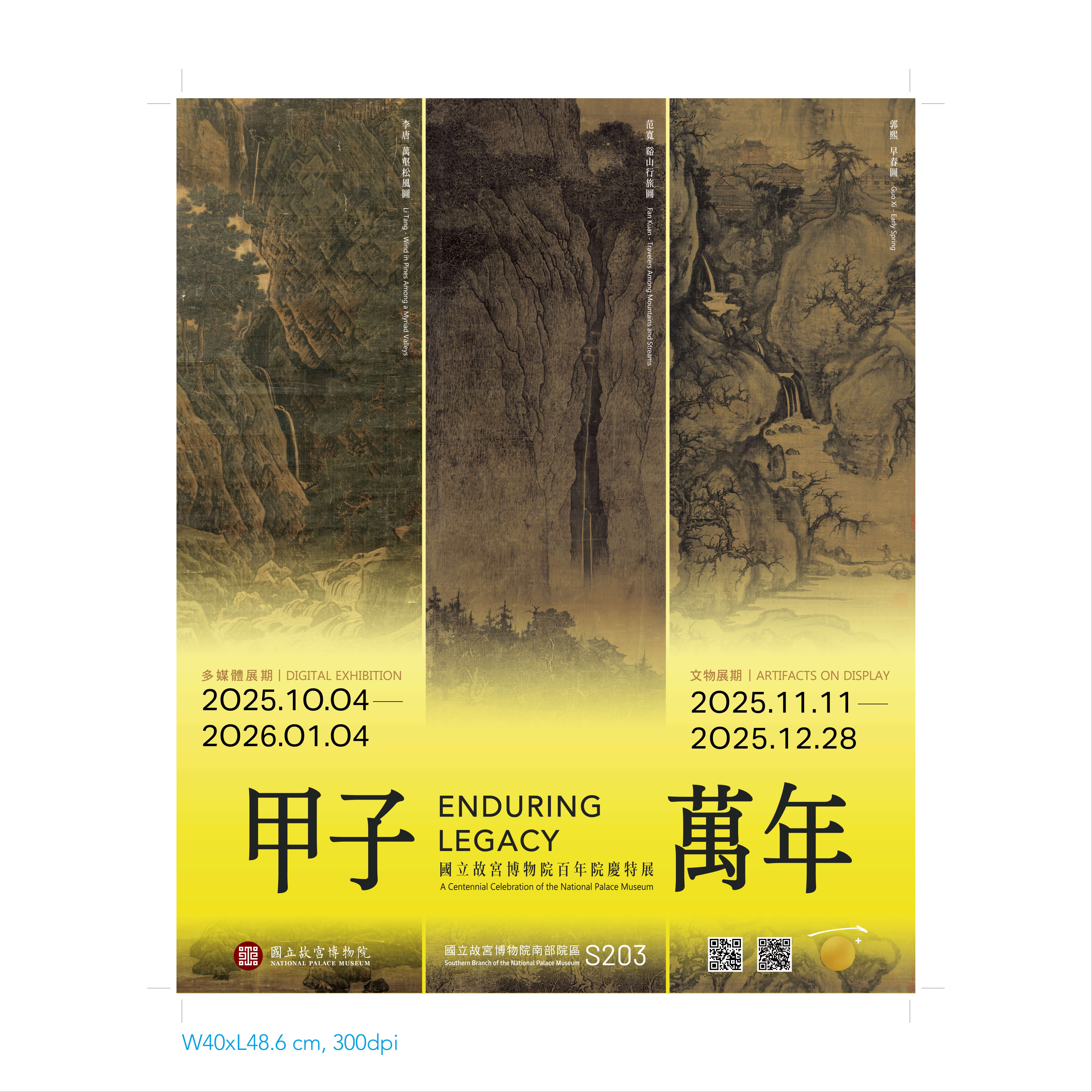 甲子萬年:國立故宮博物院百年院慶特展,南部院區特別同時展出本院3件舉世知名北宋巨碑式山水畫至寶-范寬〈谿山行旅圖〉、郭熙〈早春圖〉、李唐〈萬壑松風圖〉,文物實體展出為114年11月11日至12月28日,展期僅有42天,敬請把握