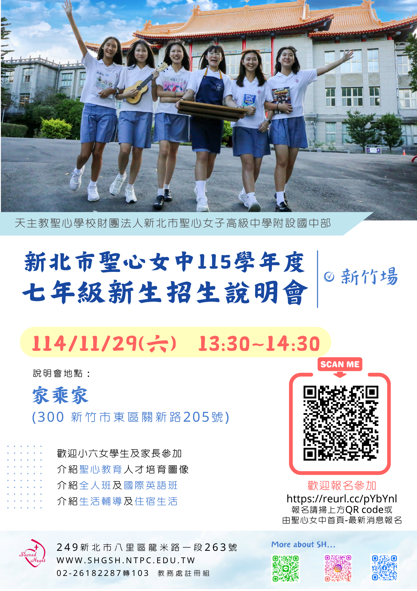 | (二) | 聖心女中首頁www.shgsh.ntpc.edu.tw—最新消息--115學年度七年級新生招生說明會(新竹場) |