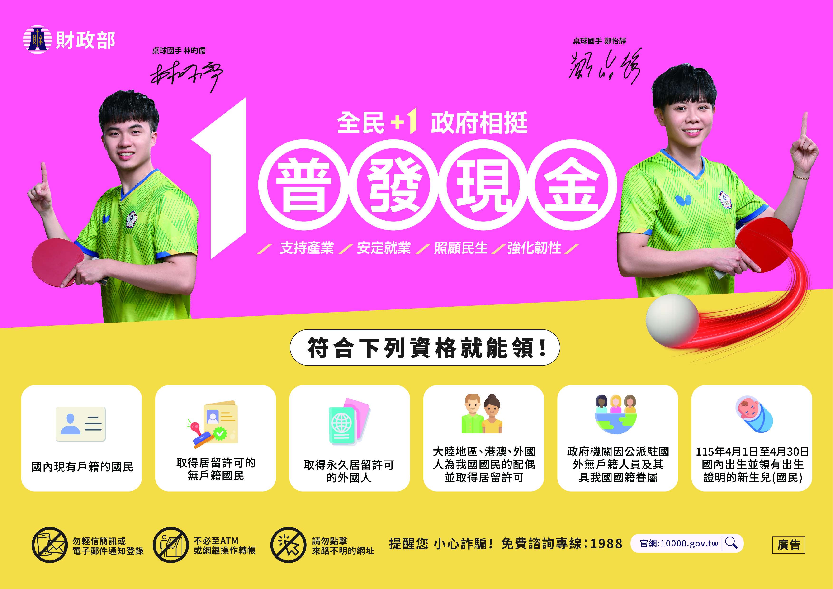 為強化民眾消費韌性,擴大內需,提振經濟效益,本部依 因應國際情勢強化經濟社會及民生國安韌性特別條例第3條 第11款規定發放現金每人新臺幣1萬元,並採「登記入 帳」、「ATM領現」、「郵局領現」、「直接入帳」及「造 冊發放」等5種方式,便利民眾領取。歡迎民眾參閱官網10000.gov.tw及附件資訊