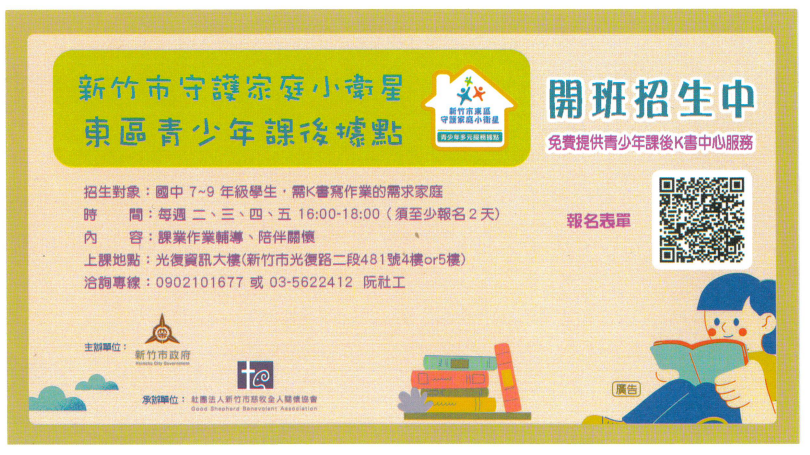 | 三、 | 檢附東區兒童課後照顧臨托據點文宣資訊1份,如有相關問 題, 可致電本據點聯絡人:阮社工,電話:03-5622412。 |