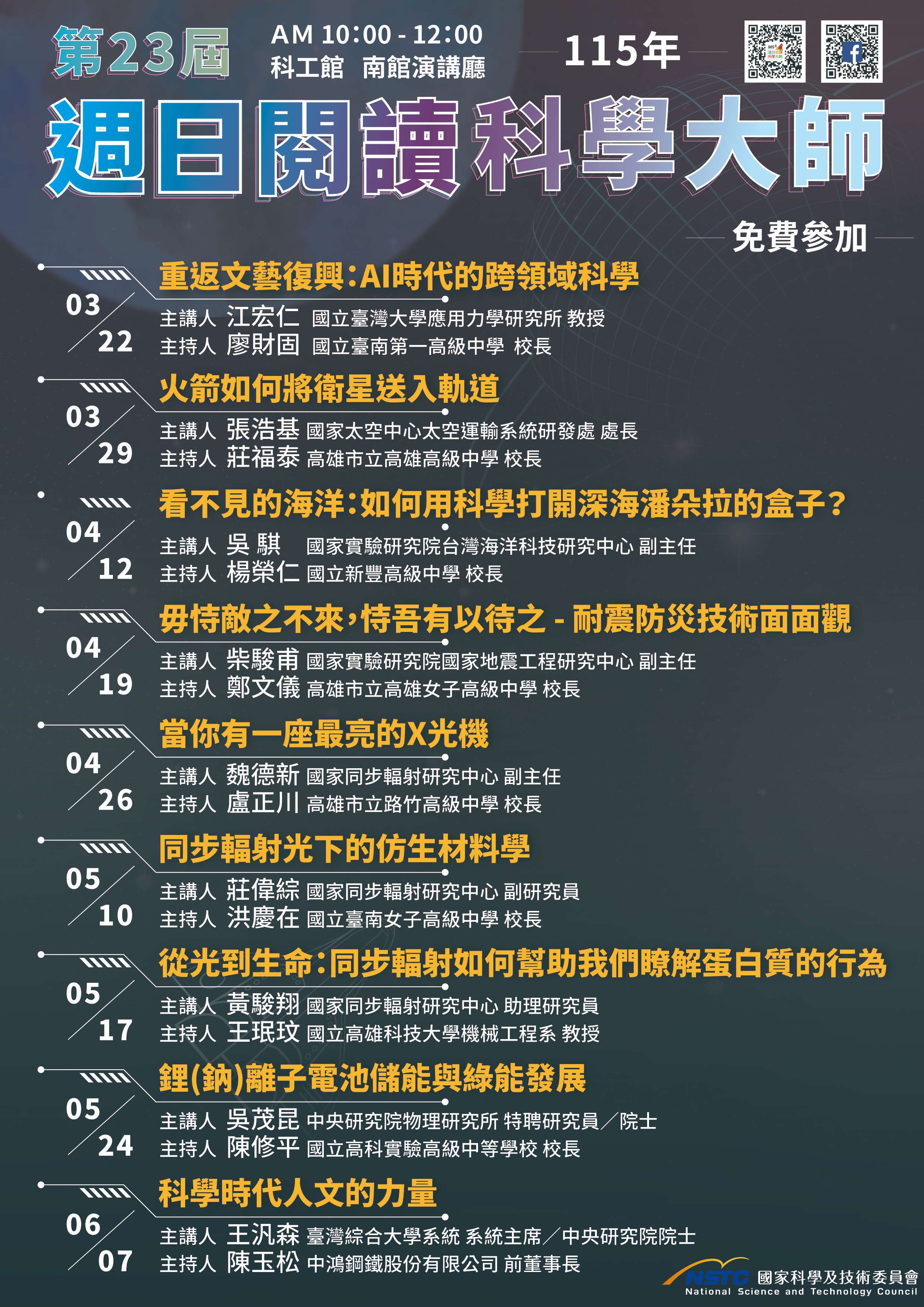 國立科學工藝博物館辦理國科會補助「第23屆週日閱讀科學大師」系列科普講座,詳如說明,請查照。
