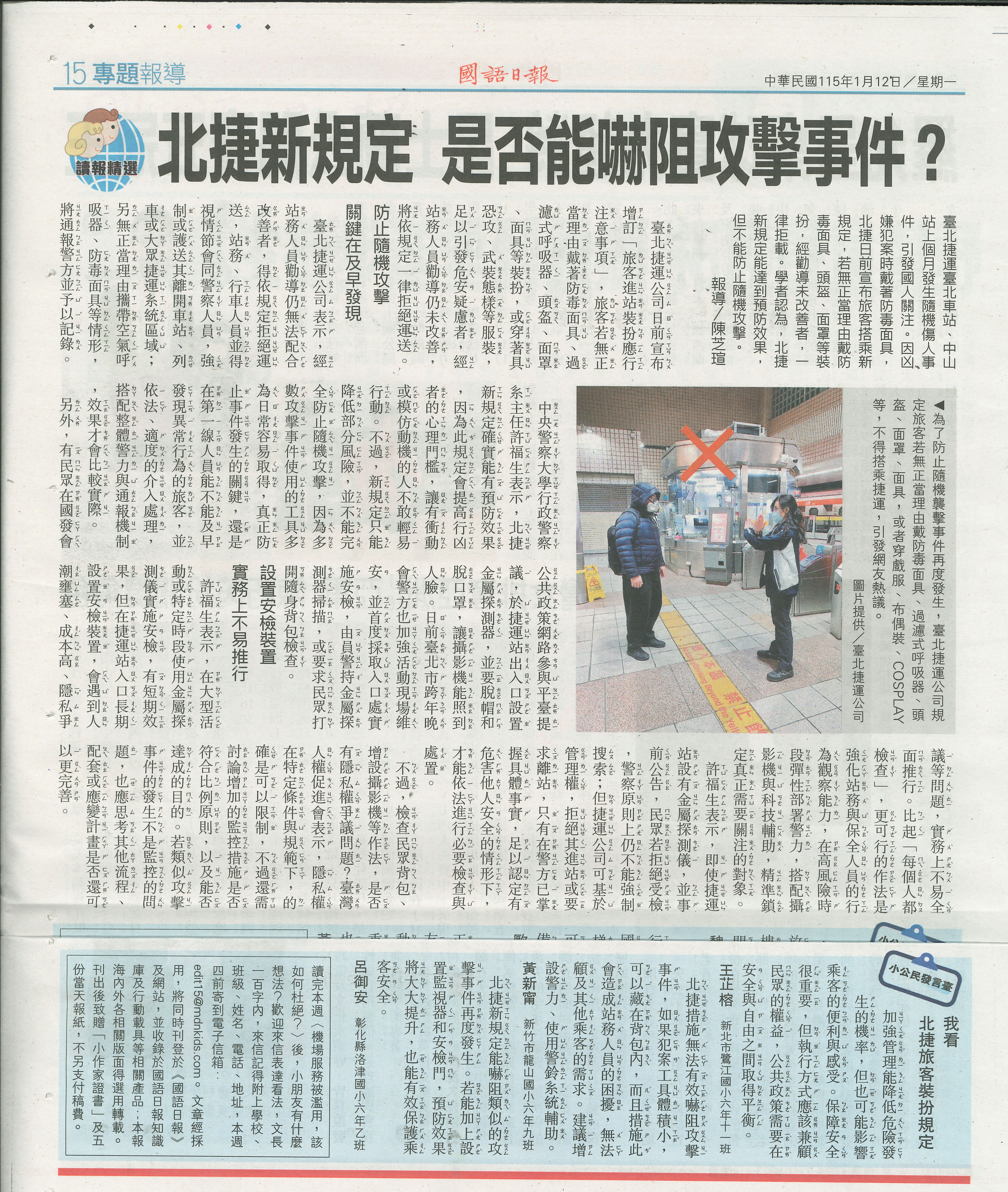 國語日報 1/12 15版專題報導~北捷新規定 能否嚇阻攻擊事件?