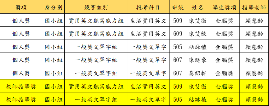 個人獎與指導老師獲獎名單如下表,恭喜獲獎學生與指導老師!