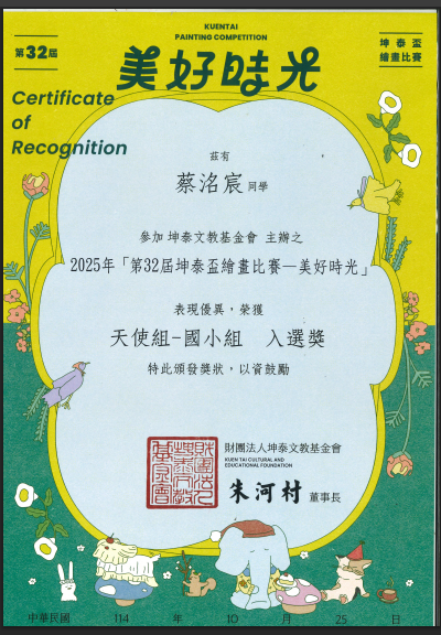 本校學生301蔡洺宸參加第32屆坤泰盃繪畫比賽-美好時光-榮獲入選獎