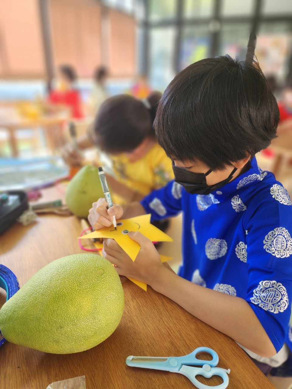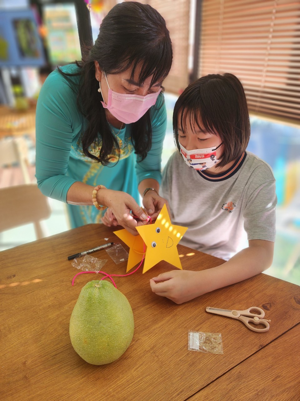 孩子在星星上畫著笑臉,為自己和家人祈福