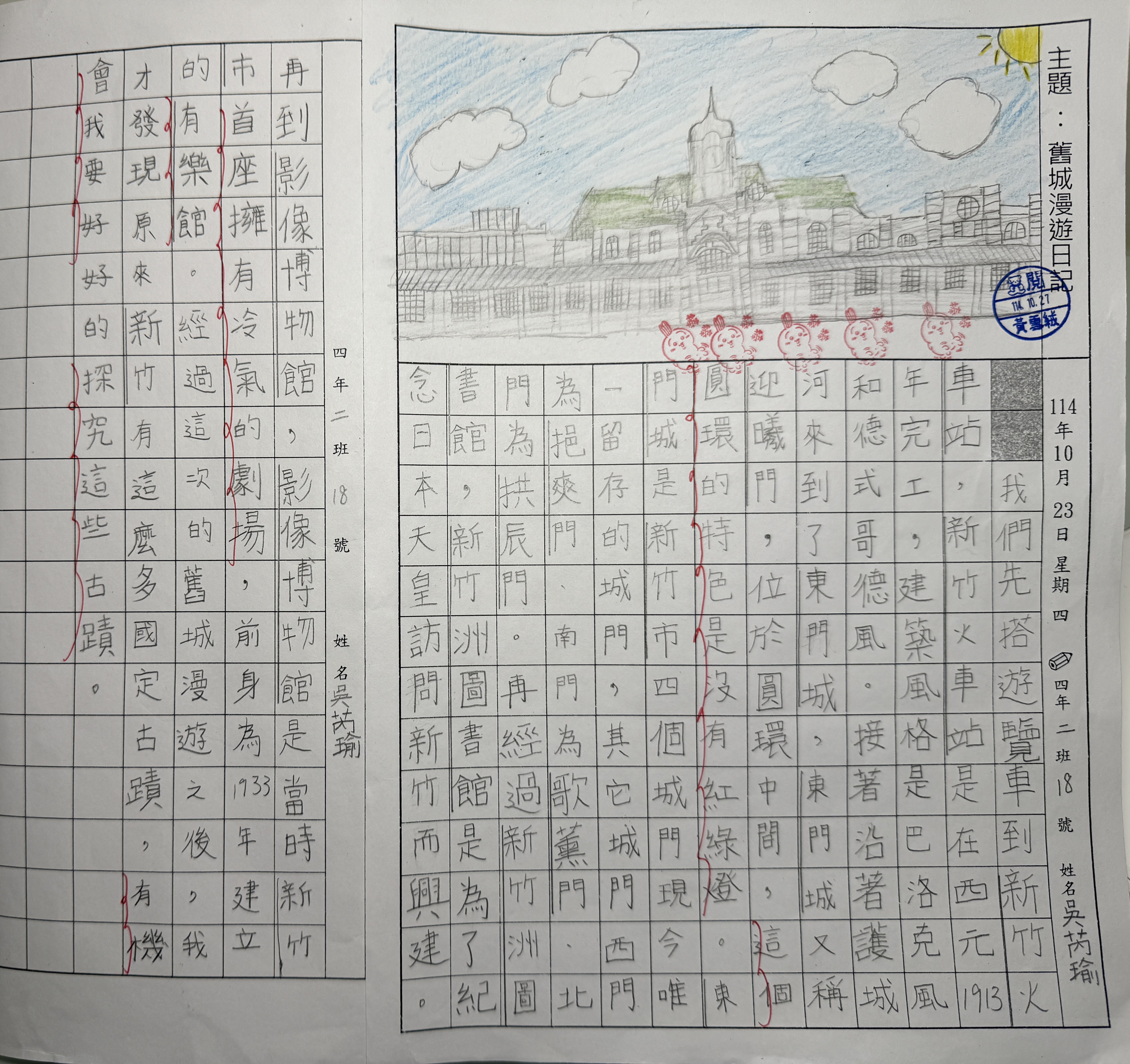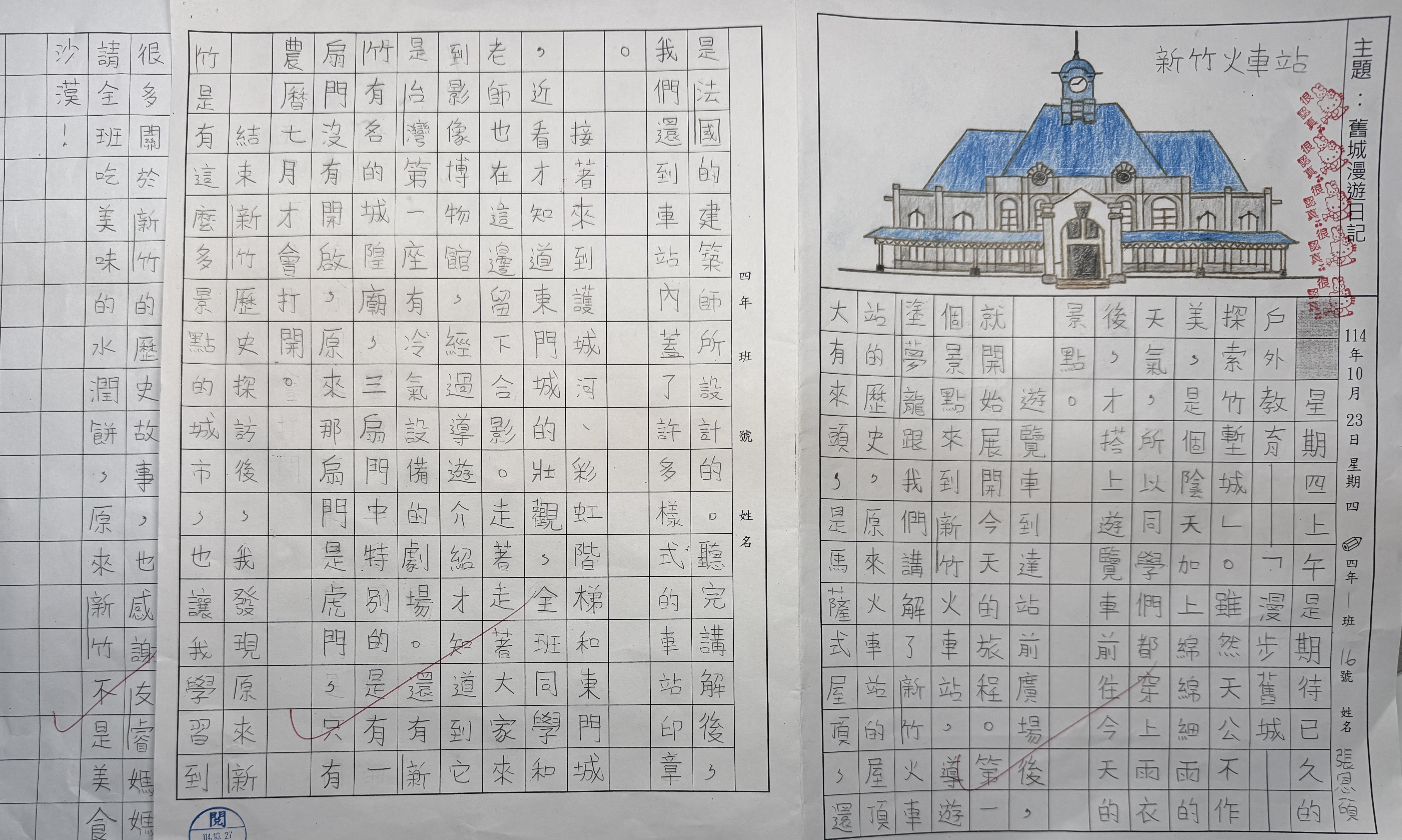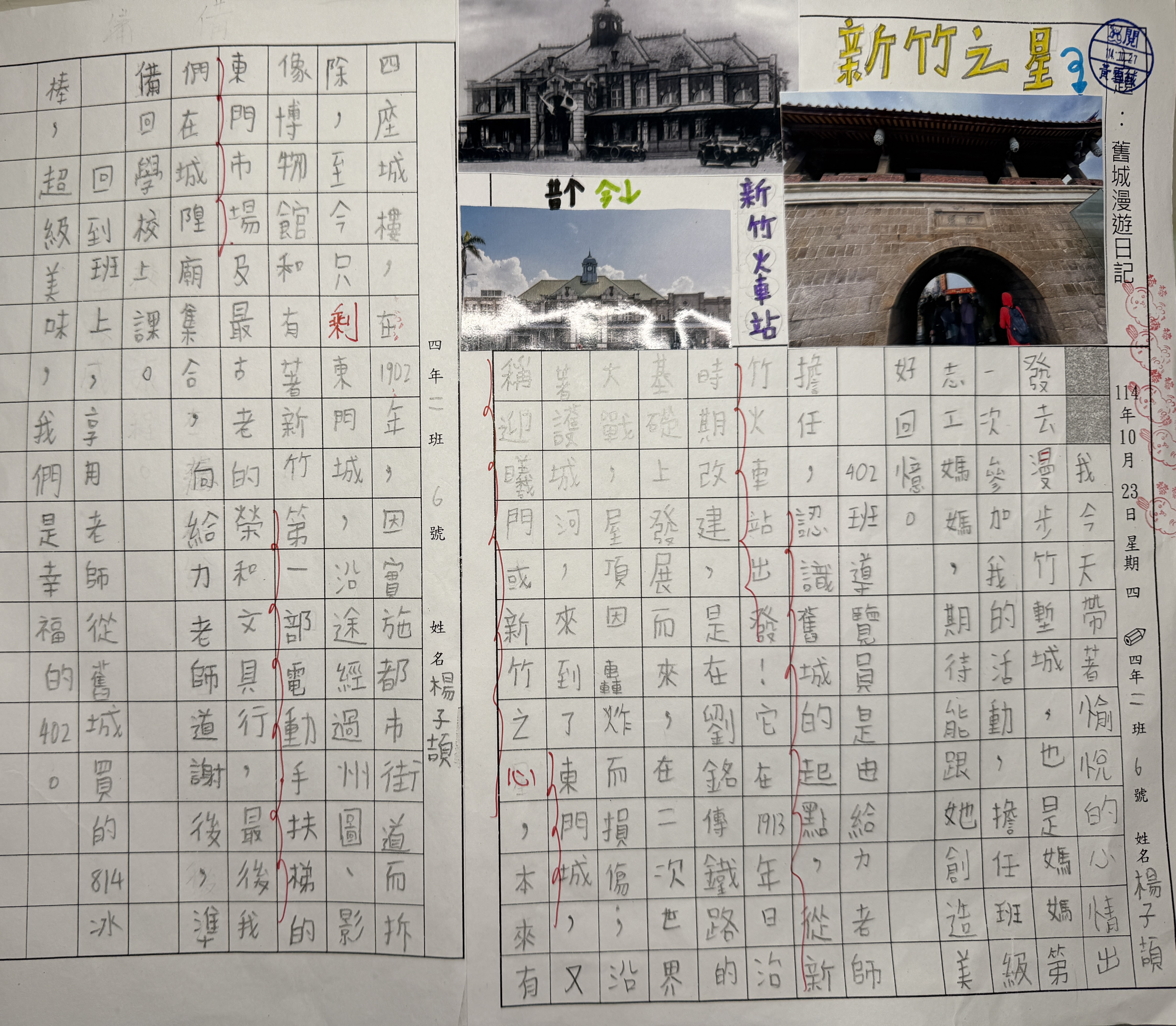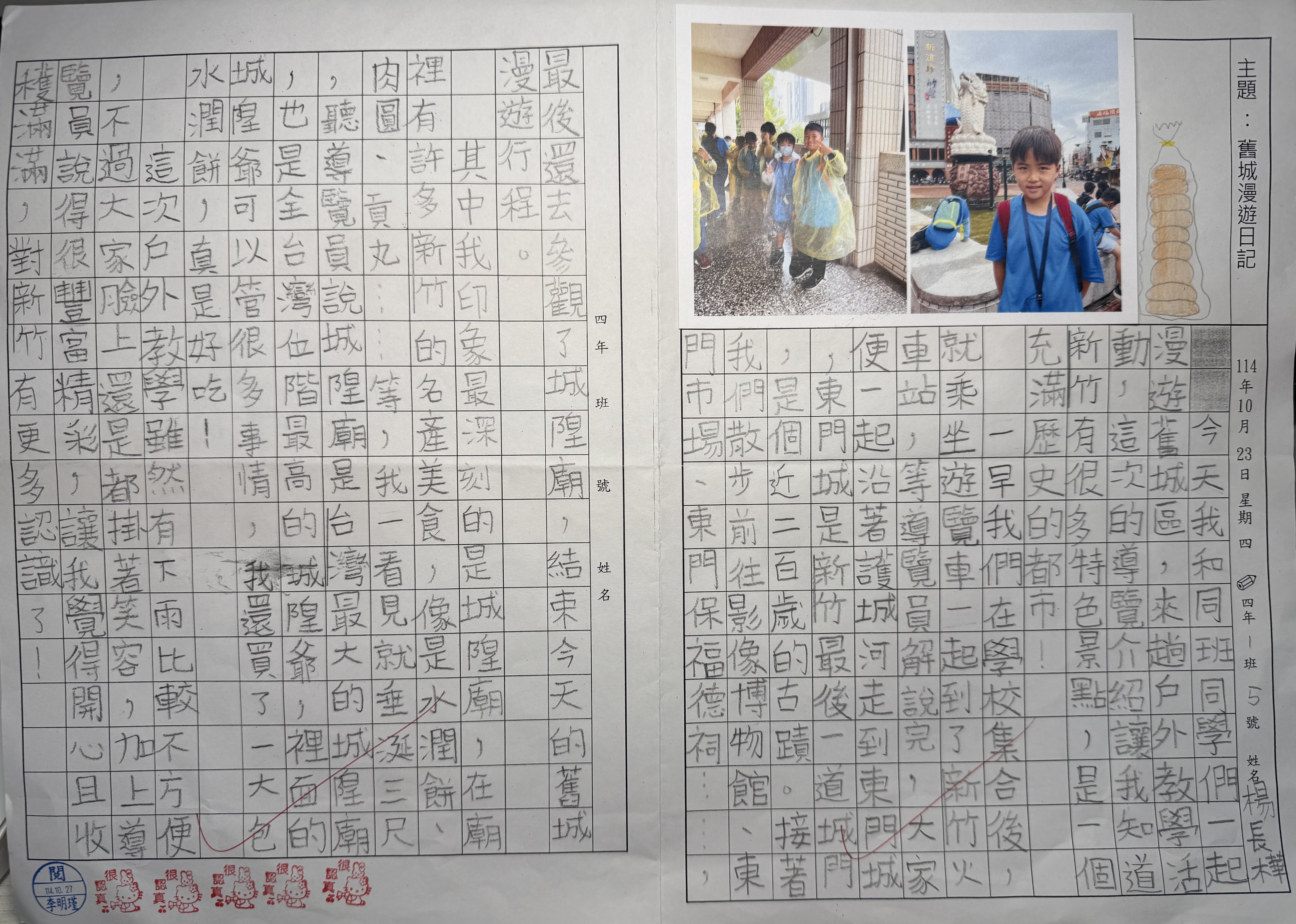 10月23日在風雨交加的日子,401.402兩班學生與一群熱心的家長,進行了一場主題跨域課程,我們學生走訪新竹火車站、護城河、東門城、影像博物館與城隍廟等地,透過導覽老師塗夢龍老師與給力老師,拿出傳家絕版圖片生動講解,深入認識竹塹城的發展脈絡與文化故事。出發前,孩子們自行查找資料、規劃路線,為探索之旅做好充分準備。當天,搭乘遊覽車並戴上導覽機的新奇體驗,讓他們興奮不已。從融合巴洛克與哥德式風格的新竹火車站,到富有歷史故事的暗街仔和新州屋,學生們以雙腳丈量城市,親身感受古都的魅力。東門市場二樓充滿文青風格咖啡廳的老闆娘熱情歡迎孩子到來,以及第一代文具行的老奶奶與孩子們合影,更為活動增添一份溫馨,讓這趟舊城之旅成為難忘的學習回憶。