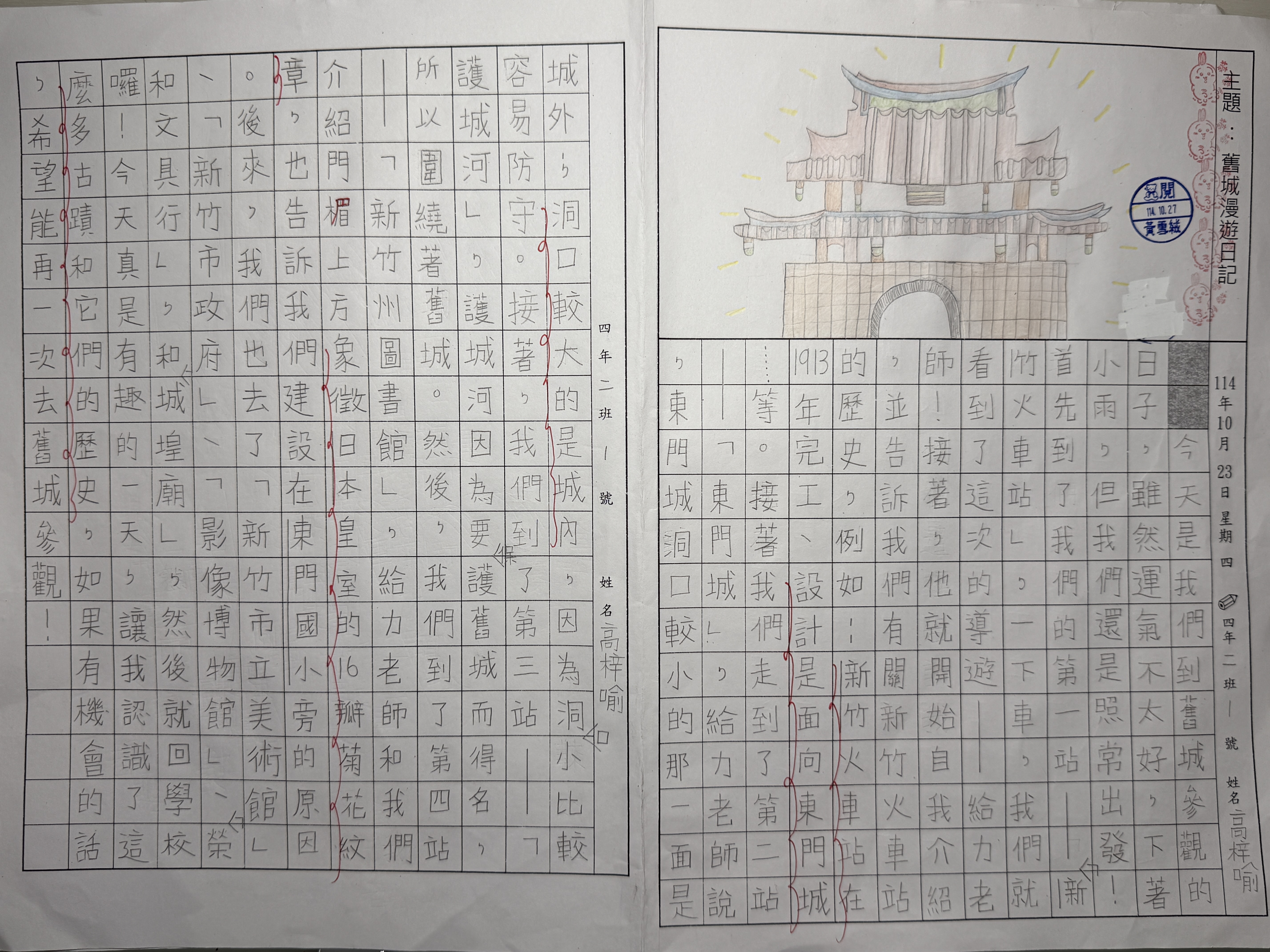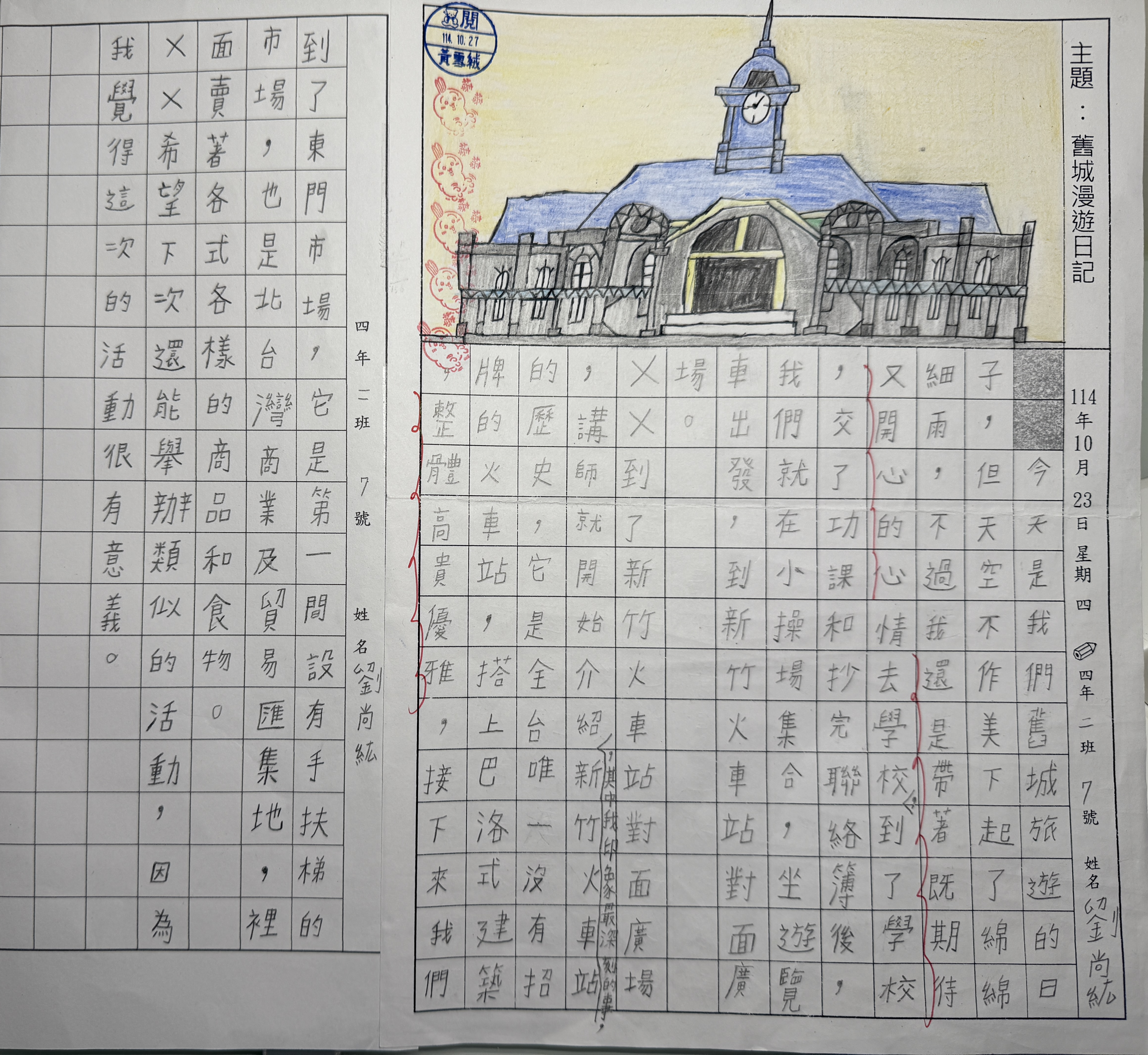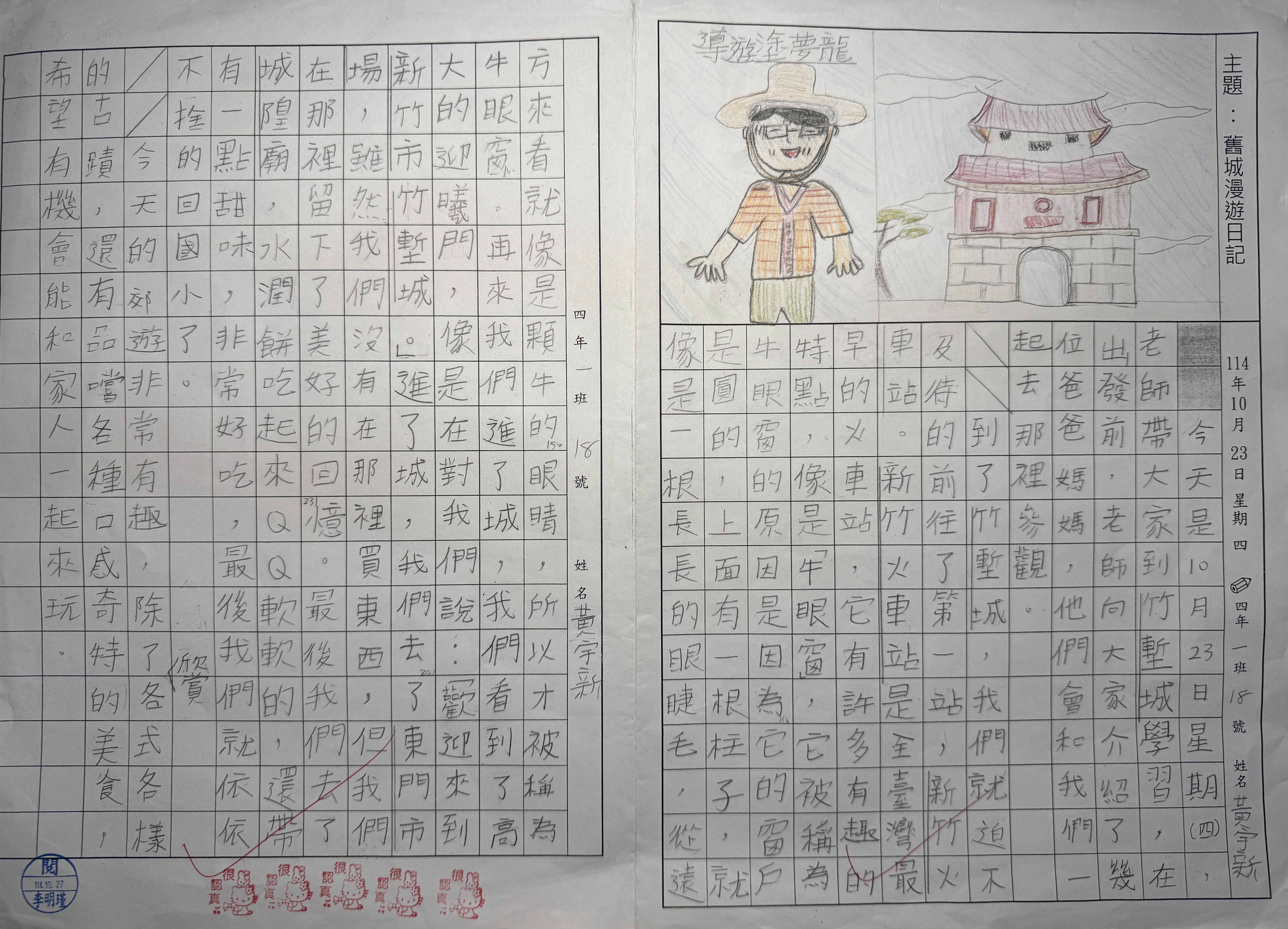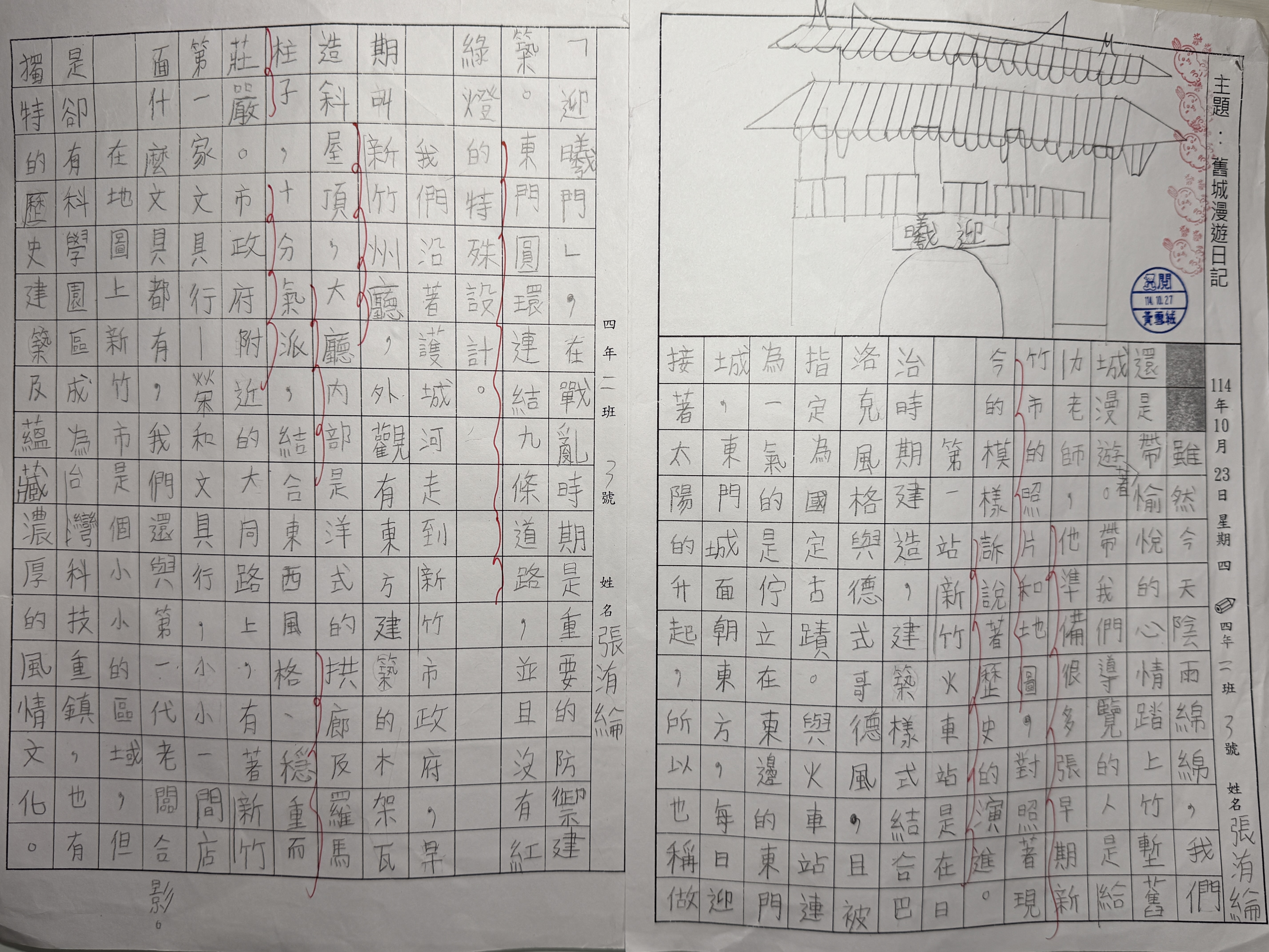 10月23日在風雨交加的日子,401.402兩班學生與一群熱心的家長,進行了一場主題跨域課程,我們學生走訪新竹火車站、護城河、東門城、影像博物館與城隍廟等地,透過導覽老師塗夢龍老師與給力老師,拿出傳家絕版圖片生動講解,深入認識竹塹城的發展脈絡與文化故事。出發前,孩子們自行查找資料、規劃路線,為探索之旅做好充分準備。當天,搭乘遊覽車並戴上導覽機的新奇體驗,讓他們興奮不已。從融合巴洛克與哥德式風格的新竹火車站,到富有歷史故事的暗街仔和新州屋,學生們以雙腳丈量城市,親身感受古都的魅力。東門市場二樓充滿文青風格咖啡廳的老闆娘熱情歡迎孩子到來,以及第一代文具行的老奶奶與孩子們合影,更為活動增添一份溫馨,讓這趟舊城之旅成為難忘的學習回憶。