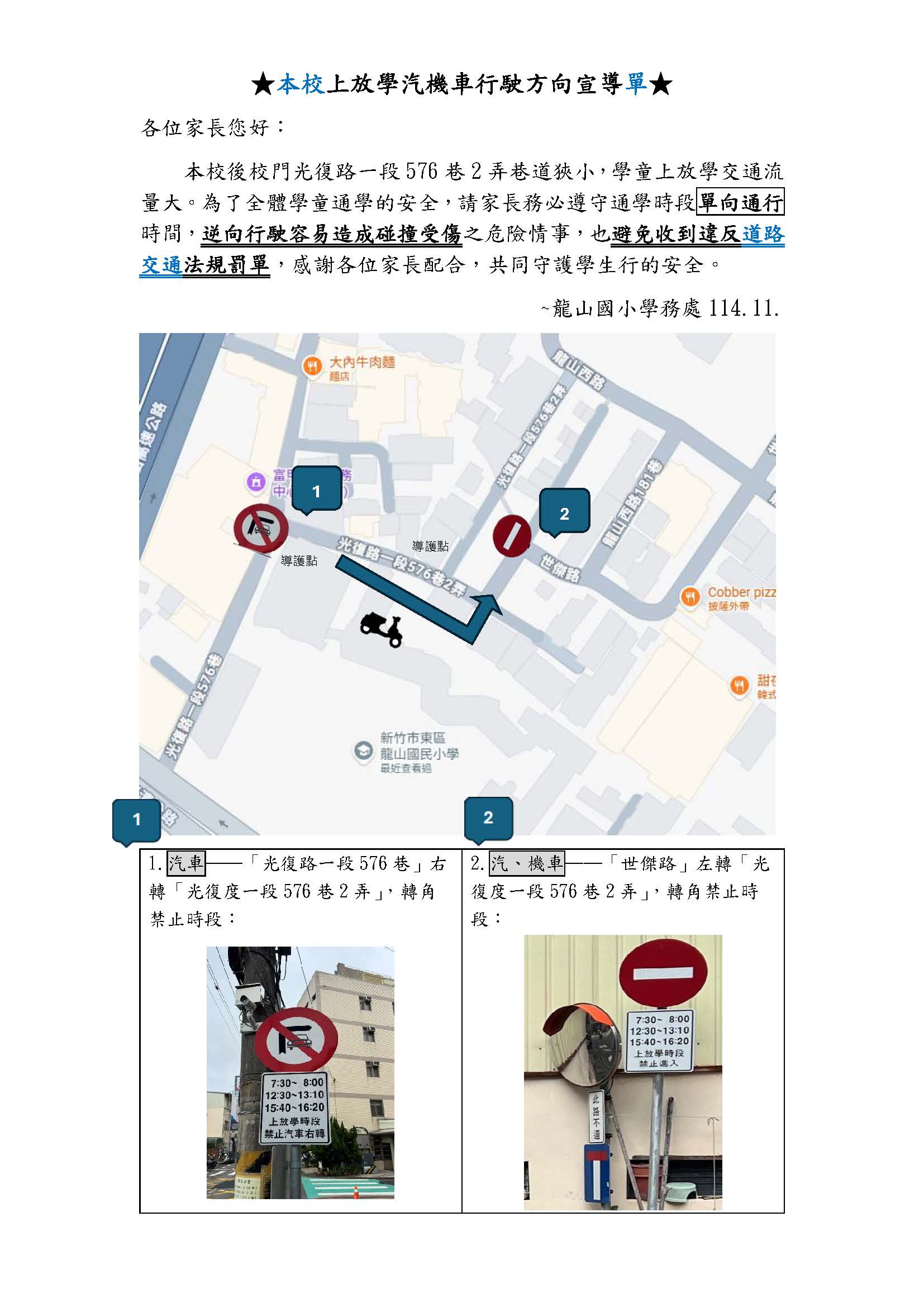 本校後校門光復路一段576巷2弄巷道狹小,學童上放學交通流量大。為了全體學童通學的安全,請家長務必遵守通學時段單向通行時間,逆向行駛容易造成碰撞受傷之危險情事,也避免收到違反道路交通法規罰單,感謝各位家長配合,共同守護學生行的安全。