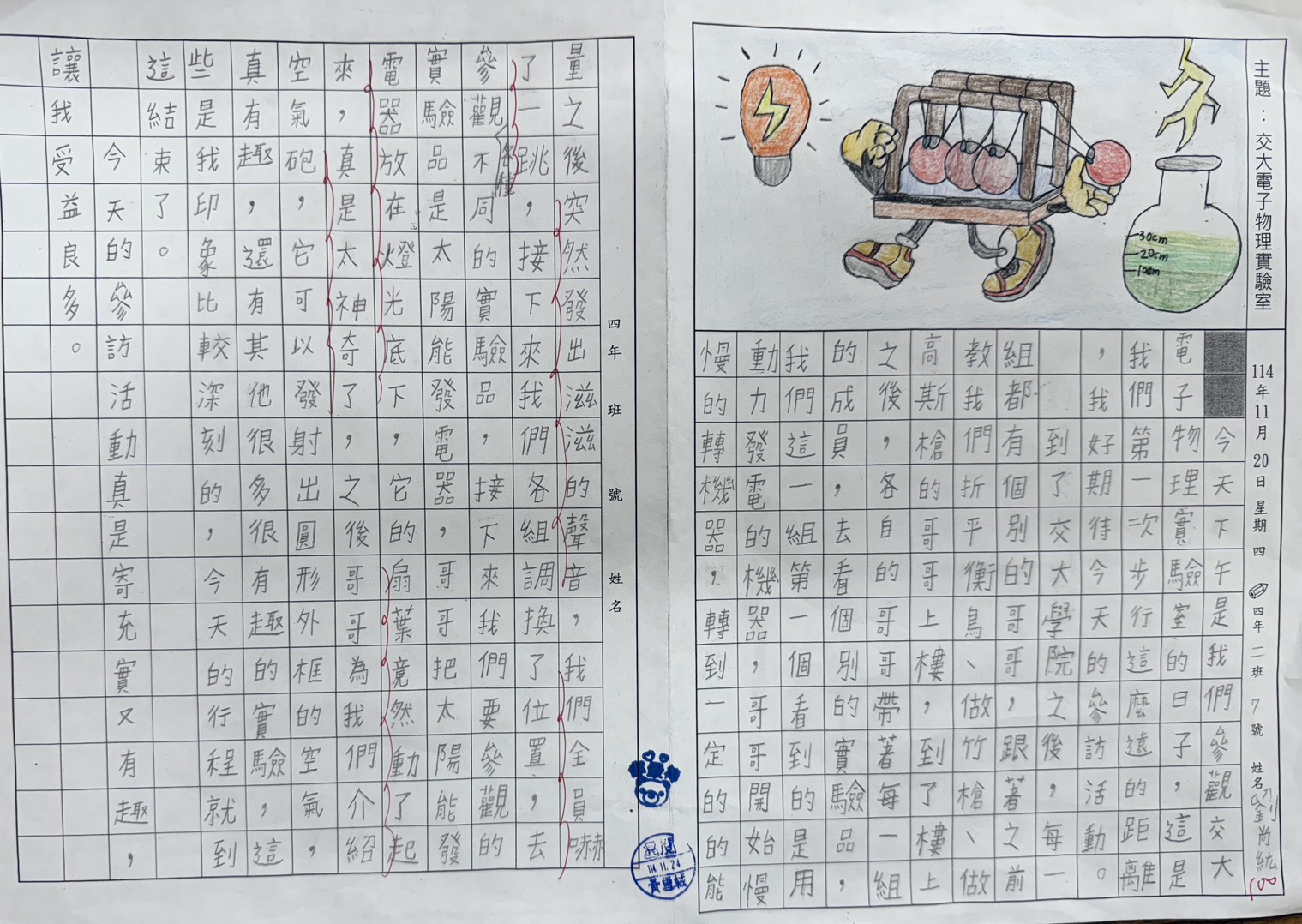國立交通大學電子物理系本學期與龍山國小合作,透過服務學習課程由大學生走入四年級教室,以自製教具與生活化科學小實驗,帶領學生動手操作、觀察現象,輕鬆認識物理原理。對許多學生而言,原本陌生甚至有些抽象的物理概念,因為大哥哥大姊姊的帶領而變得生動且易懂。孩子們在驚喜與討論中,發現科學其實就在日常生活的每一個角落。