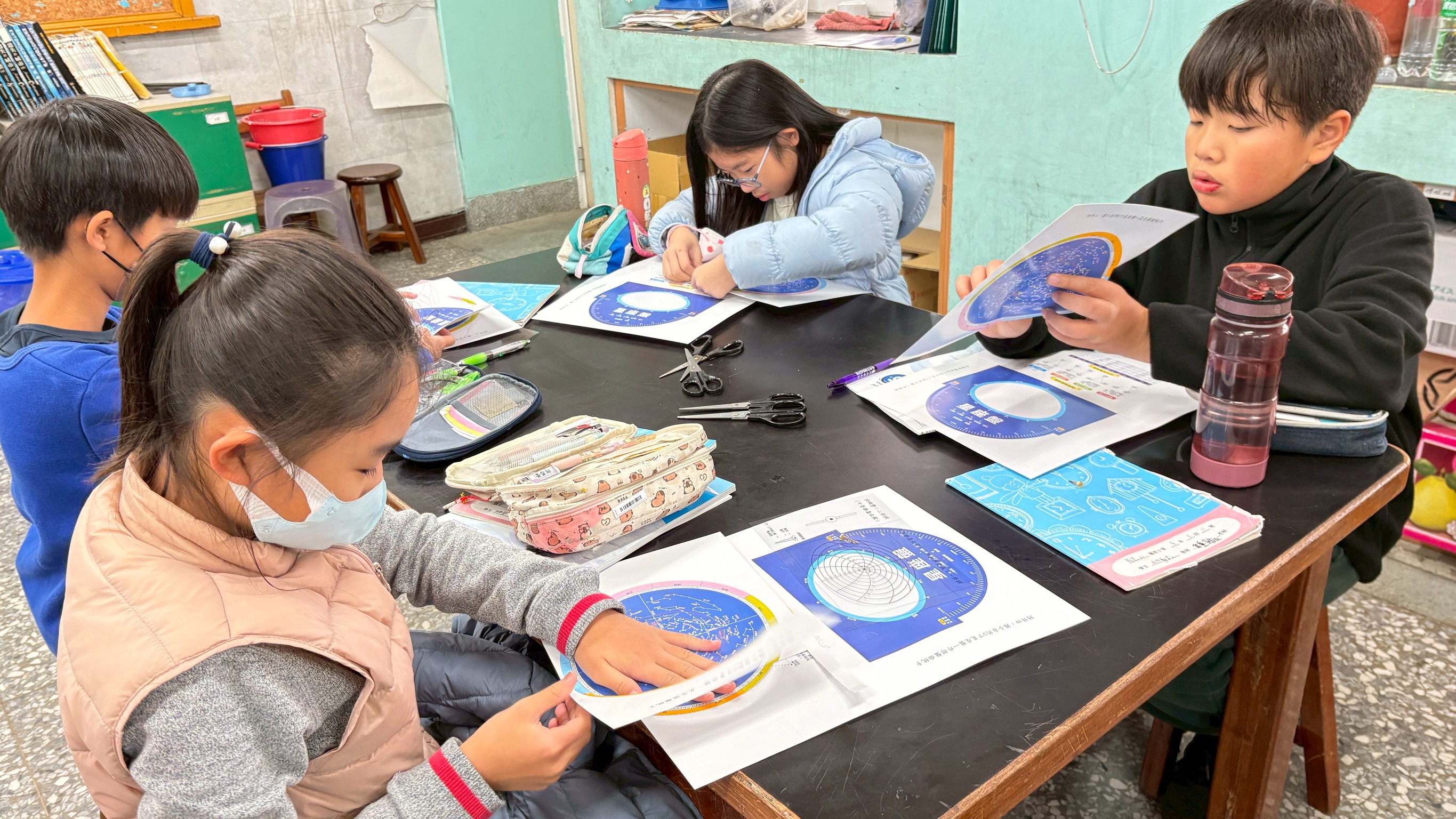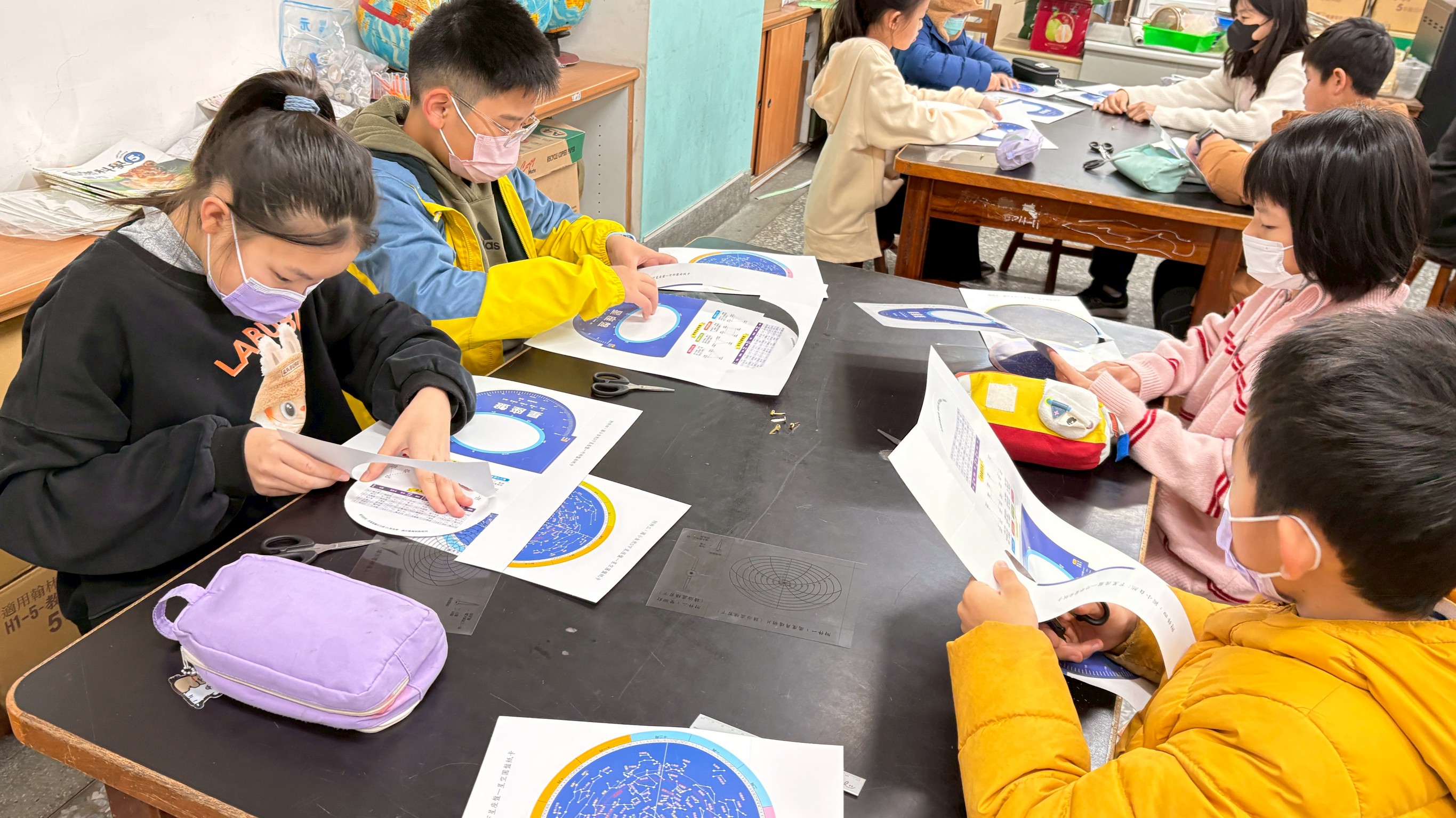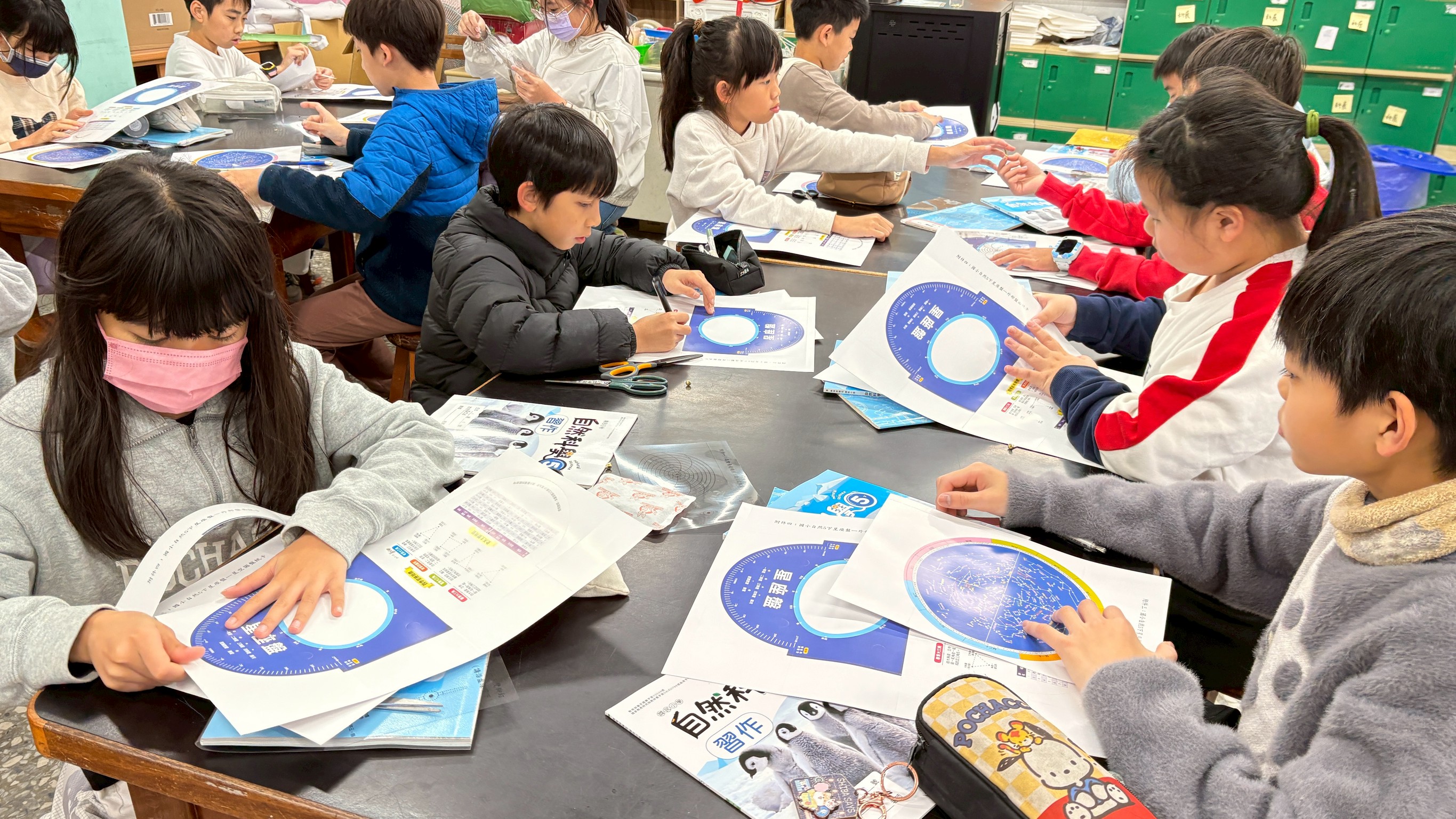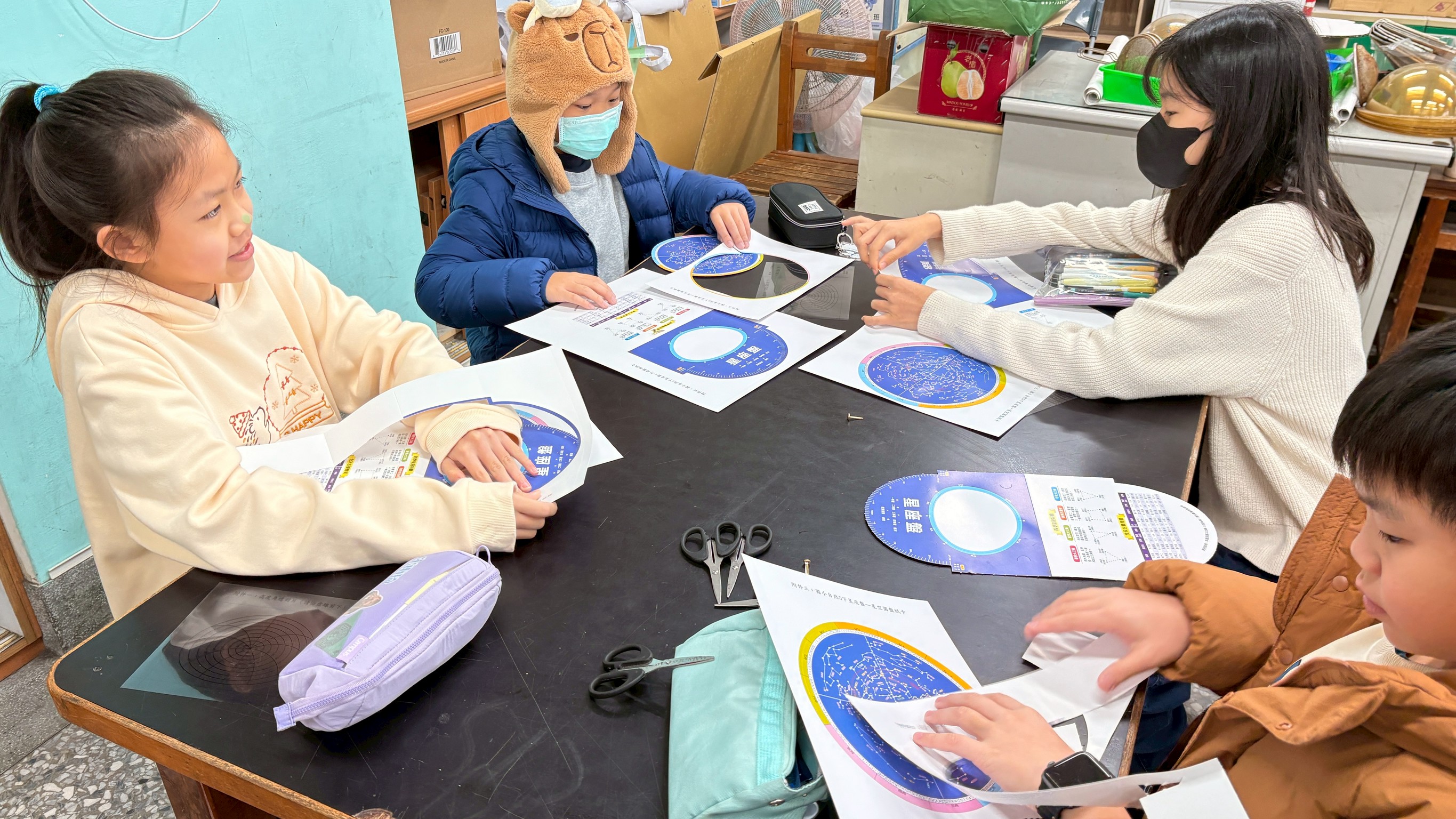 接著,學生親手製作「星座盤」。透過剪裁、組裝與標示星座位置,孩子們不僅學會辨認夜空中的星座,也體驗到動手做的樂趣。完成的星座盤成為他們觀星的好工具,增添了學習的成就感。