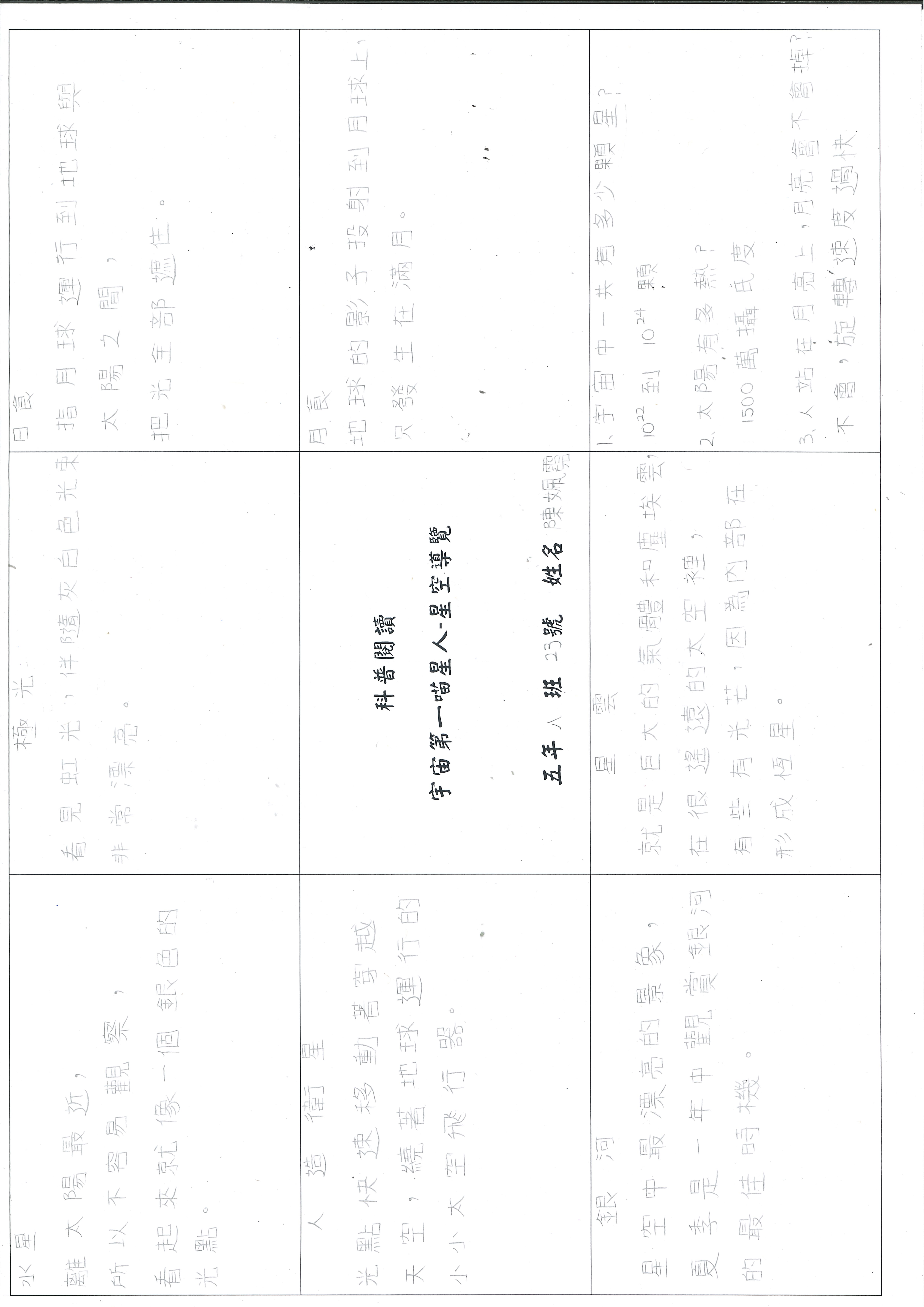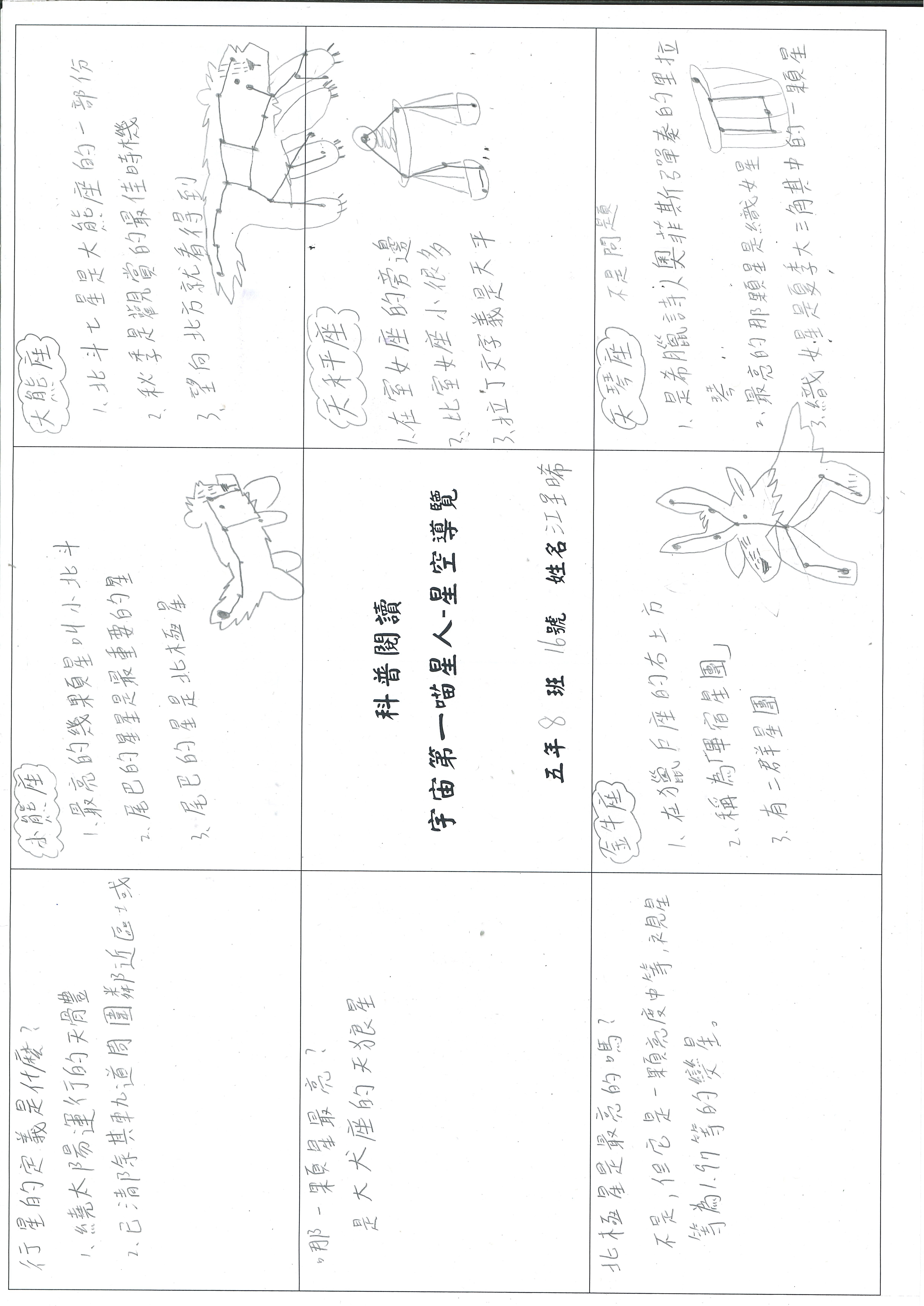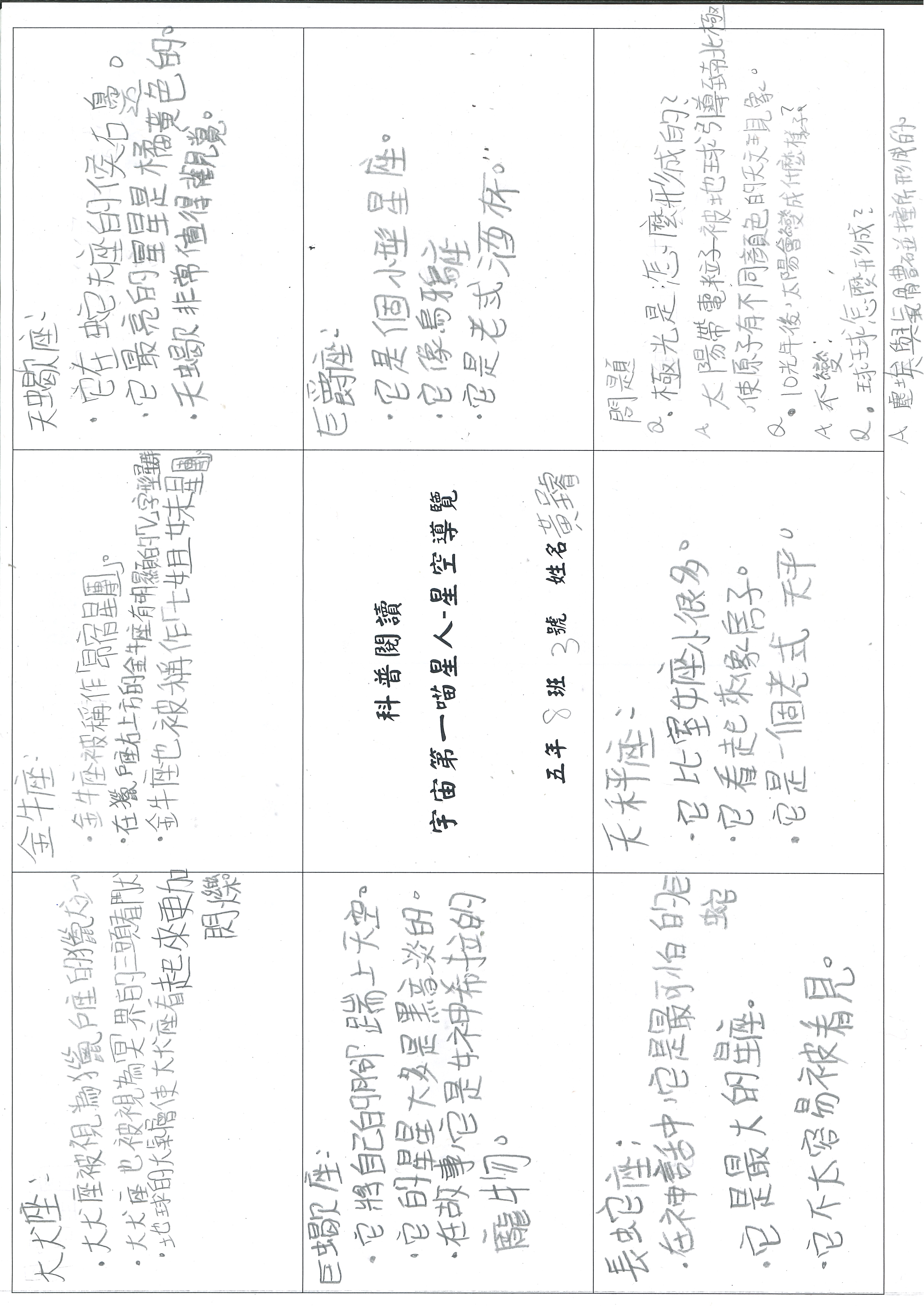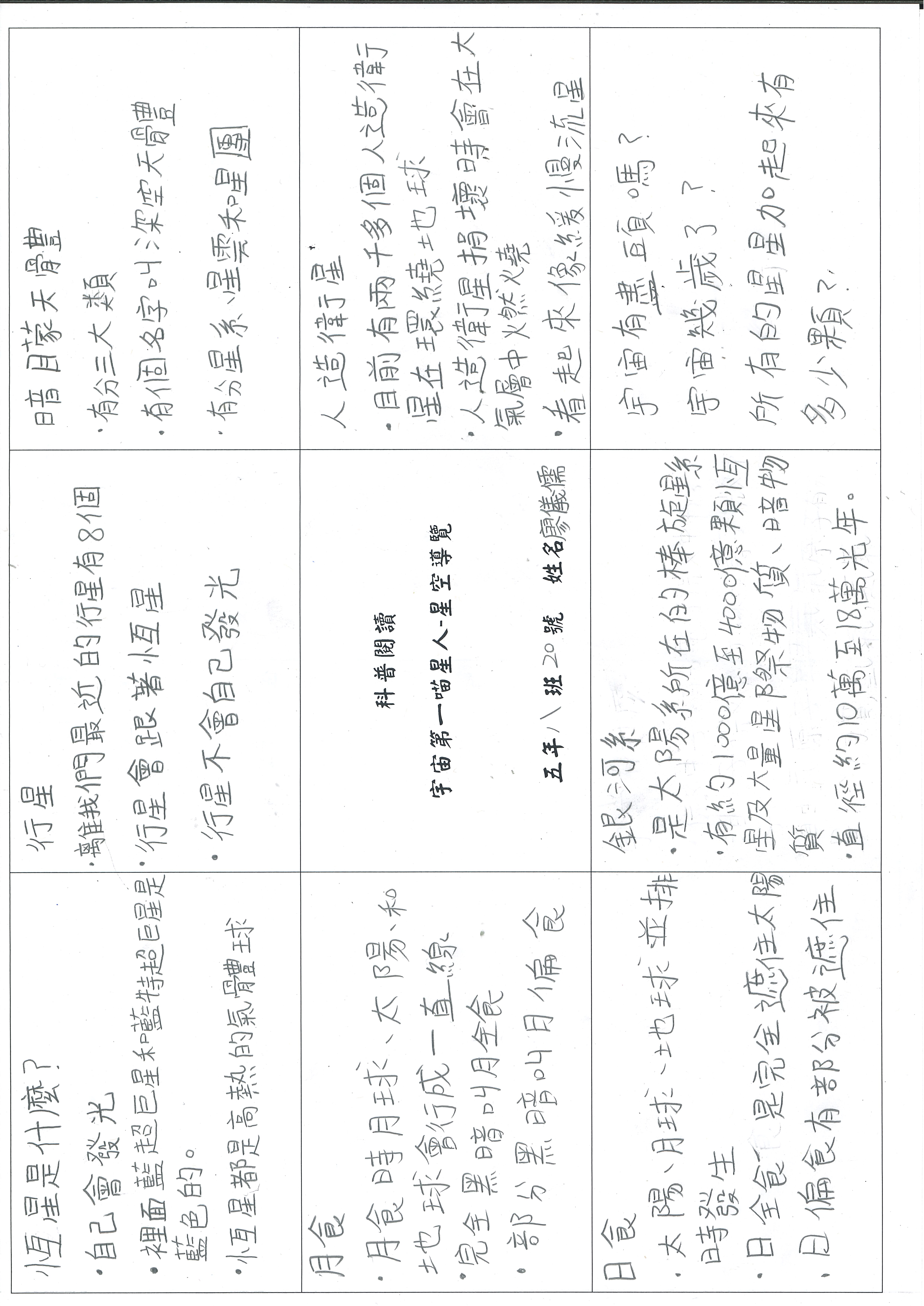 課程首先安排科普閱讀,《宇宙第一喵星人星空導覽》是一本以可愛貓咪「菲莉瑟蒂」為主角的知識型天文繪本。內容帶領學生認識八大行星、四季星座、流星及極光等觀星知識,將嚴肅的天文科學轉化為輕鬆易懂的內容。讓孩子在輕鬆氛圍中理解複雜的天文概念,激發了對宇宙的好奇心。學生學習曼陀羅思考策略,摘錄文本中最重要、有趣的訊息跟大家分享。